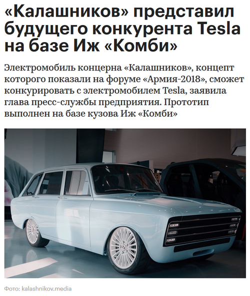 пиздец, уже даже Гардиан про эту консервную банку написал. www.theguardian.com/environment/2018/aug/23/kalashnikov-takes-on-tesla-with-retro-look-electric-supercar~The vehicle can travel 217 miles (350km) on one charge