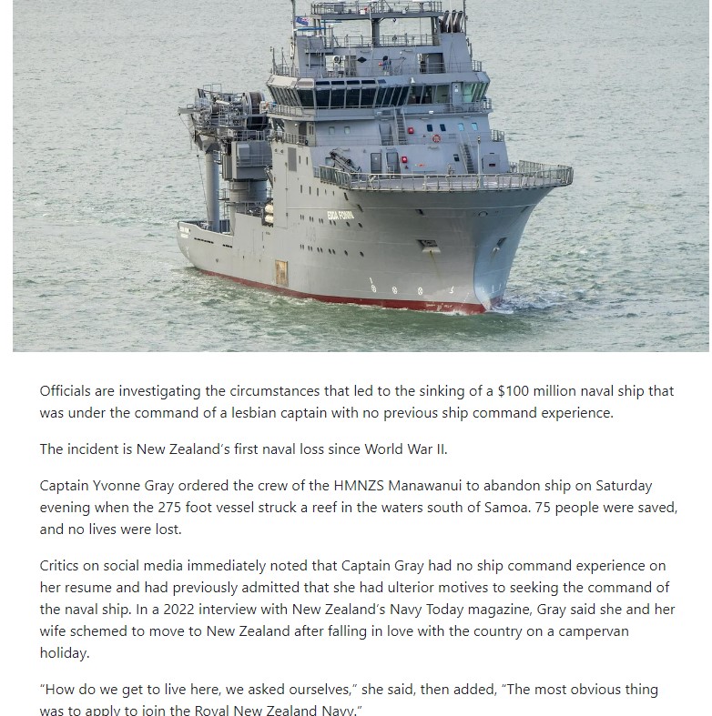В общем, суть в том, что где-то далеко, у берегов Самоа, налетело на рифовую мель, развалилось и затонуло судно ВМС Новой Зеландии. Которым управляла женщина-лесбиянка.