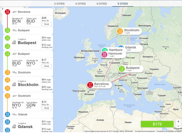 Работает очень просто: задаете диапазон дат, город вылета (возврат происходит в него же) и зону (весь Евросоюз или только шенгенская зона). Он вам подбирает варианты на 2,3,4 или 5 городов. Между вариантами можно переключаться. Для выбранного варианта по каждому виду перемещений есть ссылка на покупку билета или бронирования проживания. И получается реально дешево, хотя понятно, что перелеты - всякими лоукостерами, а проживание - апартаменты.