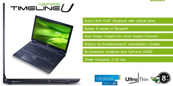 Вот эту машинку (Aspire M3) нам дали подержать в руках (это пока типа как предсемпл) - она реально обалденная, по крайней мере с точки зрения внешнего вида. Но нужно тестировать, чем я и займусь, когда выйдет серийный образец. Это продолжение линейки Timeline - вот у меня как раз ноутбук для разъездов от этой серии, - которая переходит в разряд ультрабуков.