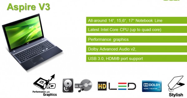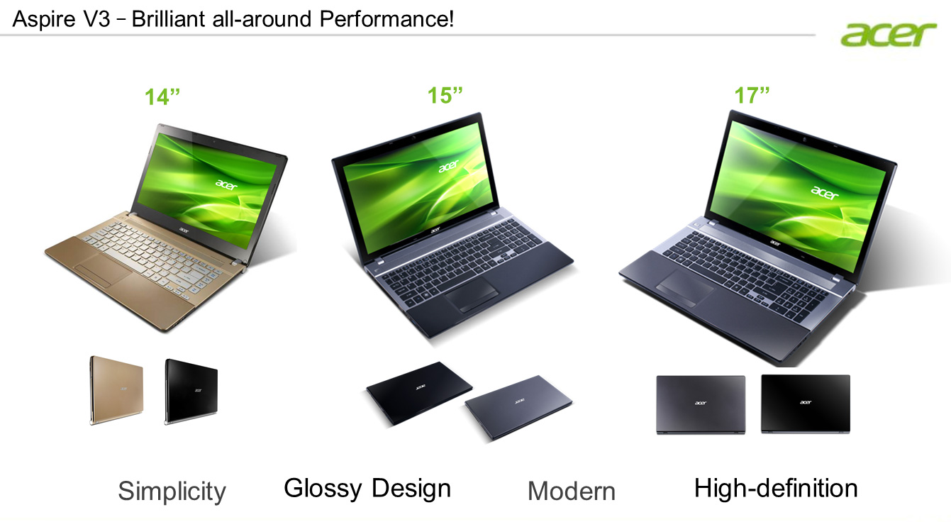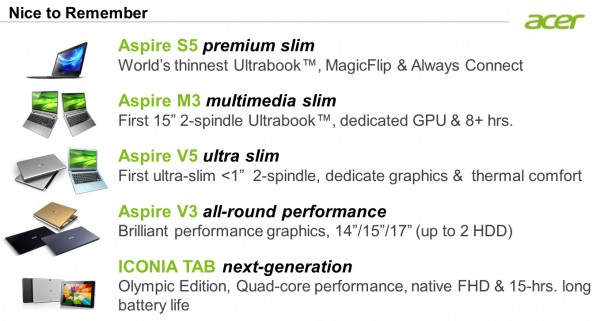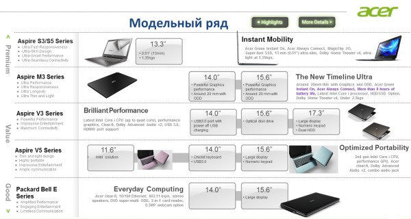 А вот это совсем интересная табличка - новый модельный ряд от Acer и новые правила маркировки устройств (все кликабельно). Что я там выяснил? Дескноуты 18" они выпускать прекращают. Будут только 17,3". При этом обещают на 17,3" наконец-то FullHD, чего раньше не было даже на 18". Знаменитая серия Timeline переходит в M3, причем это уже будет называться ультрабуками - отвечают всем критериям.