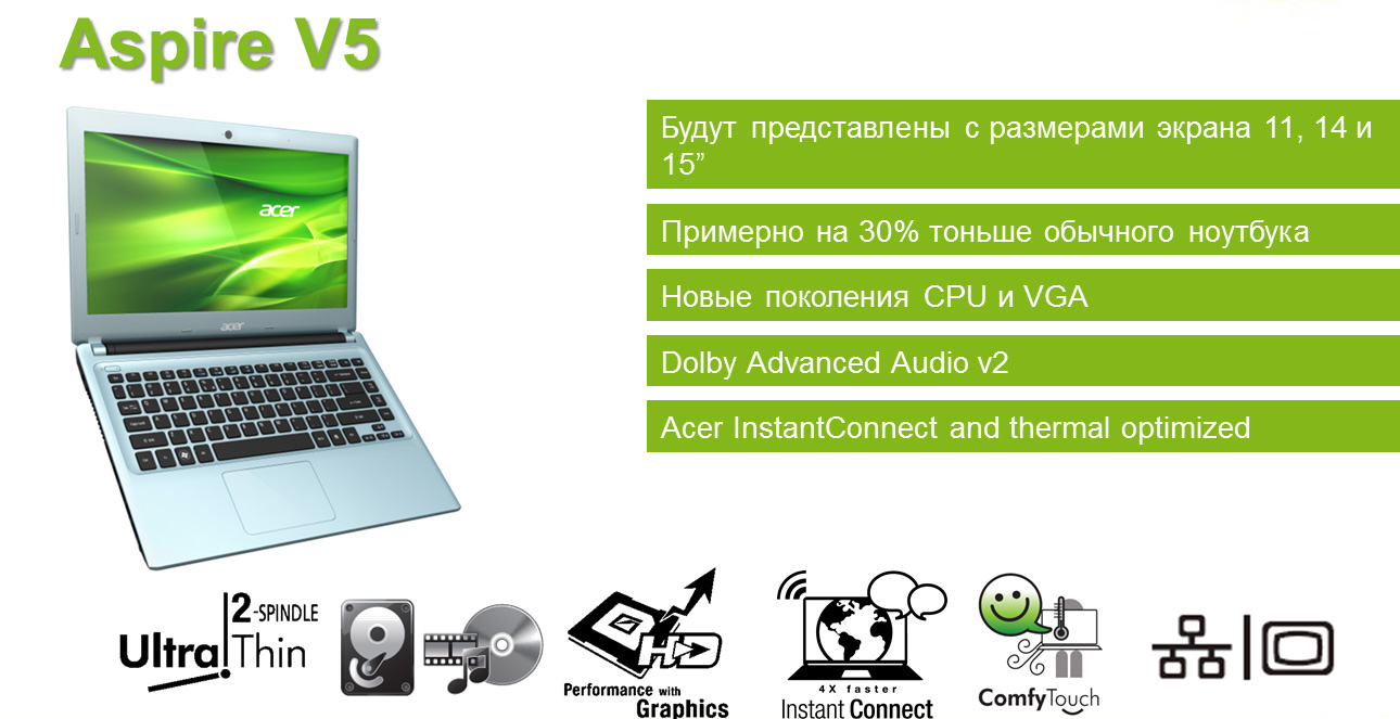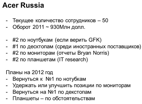 Вот наконец-то дошли руки написать о планах Acer, о которых компания рассказала в Каннах. На самом деле было реально интересно, потому что я, как уже говорил, использую для разъездов именно ноутбук от Acer и им очень доволен, а сейчас собираюсь прикупить еще и один из топовых дескноутов - для работы в Испании. До того я покупал ASUS N53SV - дескноут, кстати, неплохой, однако когда клава вылетает через неделю использования - оно как-то явно сильно неправильно. И надо было слушать пацанов, которые в комментах к записи о муках выбора сразу сказали, что уж что-то, а клава там реально ужасная. Они были правы. Впрочем, вернемся к Acer.