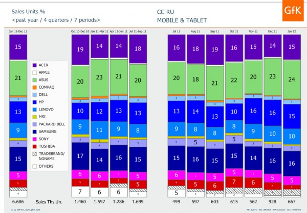 Доля Acer рынка ноутбуков по Европе-Африке по данным независимых исследователей - второе.
