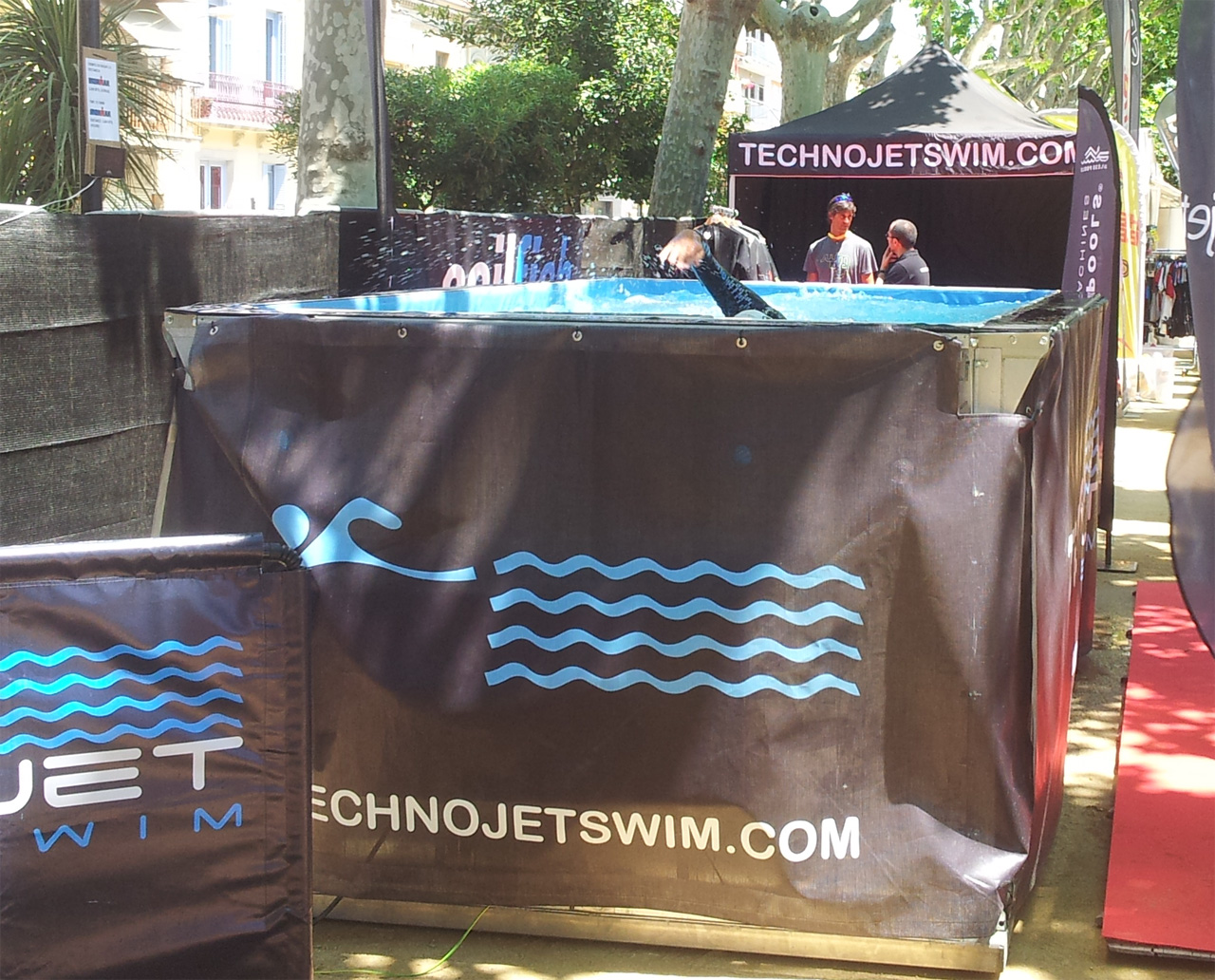 Интереснее всего выглядела вот эта бандура - ее можно установить на своем участке, задать режим скорости движения противопотока и плавать себе на сотни километров, находясь на одном месте. Пловец в этом корыте как раз и демонстрирует сам процесс. Что-то вроде беговой дорожки, но для пловцов.