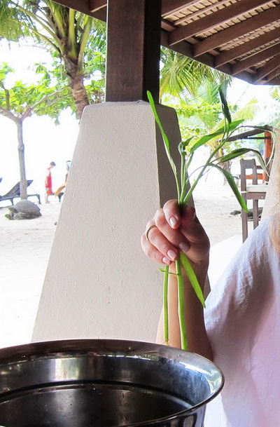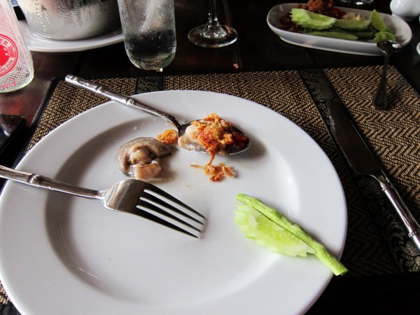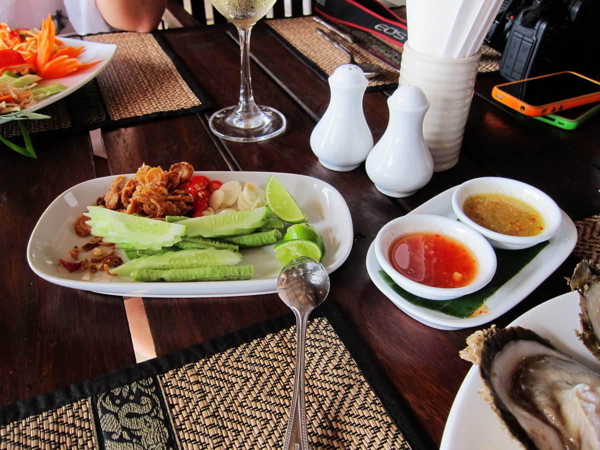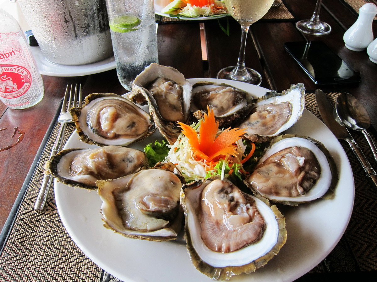 Я по привычке полил устрицу лаймом (лимоны тут не попадались, один лайм) и съел, но тут прибежал встревоженный официант и сказал, что я их совершенно неправильно употребляю. По местным законам надо есть так. Он срезал устрицу ножом, разрезал на две части. Одну часть положил в ложку, полил лаймом, посыпал чесноком, красным жгучим перцем, обжаренным луком, полил двумя видами соусов.