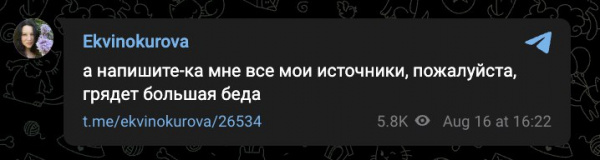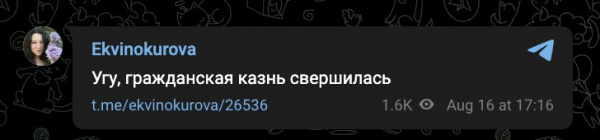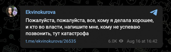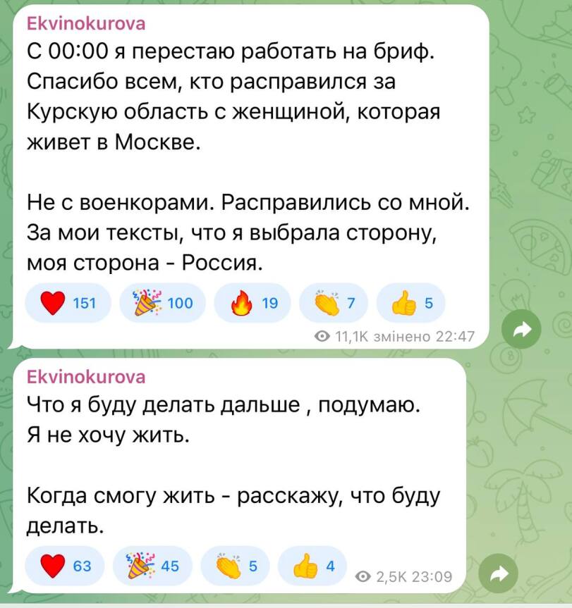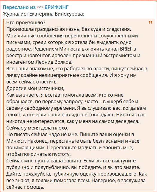 Сегодня Telegram-каналы «BRIEF» и «BRIEF Важное», в которых она занимает руководящие должности, признали «иноагентами». В канале «BRIEF Важное» также было опубликовано сообщение о том, что по пятницам в РФ невиновных людей лишают «гражданских прав».