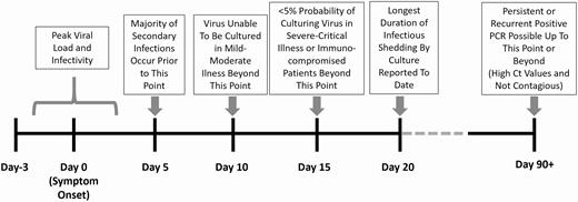 2. Contagiousness rapidly decreases to near-zero after about 10 days from symptom onset in mild-moderately ill patients and 15 days in critically ill and immunocompromised patients. The longest duration of viral viability that has been reported thus far is 20 days from symptom onset.