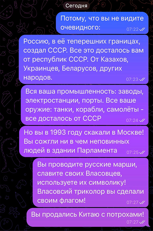 Сомневающихся тоже бесполезно. Я уже почти 1,5 года пытаюсь переубедить младшего брата- результат нулевой. Он конечно не настолько упорот, как наш отец, но и что-то объяснять ему бесполезно, ответ один - "с украинской стороны тоже пропаганда и ты её слушаешь, ты ей поддалась, не всё так однозначно". При этом он задаётся вопросом, за что погиб его хороший знакомый, с которым они вместе когда-то работали на заводе, и которого в сентябре забрали по мобилизации, и не находит внятного ответа. Но обвиняет меня, что "вот ты всегда за Украину, хотя это они хотели напасть, а мы превентивно ударили". Теперь стараемся не говорить с ним на тему войны, чтоб не разосраться окончательно. С отцом уже давно перестала говорить на эту тему, ибо там всё совсем глухо. И как же сильно мне не хватает мамы, потому что с ней у нас были одинаковые политические взгляды, но в то же время я вздыхаю с облегчением, что она не дожила до этого кошмара, иначе если не рак, то разочарование в муже и сыне её бы добили.