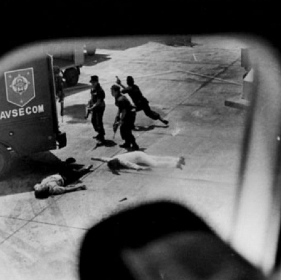 21 августа 1983 года в международном аэропорту Манилы сразу же после выхода из самолета был убит Бенигно Акино, лидер оппозиции диктатору Фердинанду Маркосу. На фото трупы Акино и его убийцы — сотрудника спецслужб.