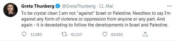 "Кляйн является активной сторонницей кампании BDS (Boycott, Divestment and Sanctions, "Бойкот, изоляция и санкции"), которая стремится нанести ущерб израильскому государству в экономическом, культурном и политическом плане. Движение FFF также поддерживает BDS. В понедельник на странице FFF в Instagram появилось несколько сообщений, обвиняющих Израиль в недавней эскалации. В них Иерусалим также обвиняется в "этнической чистке" и звучат призывы к бойкоту Израиля".