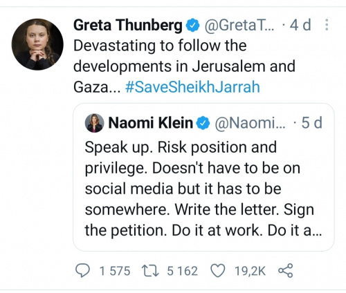 "Грета Тунберг - кумир миллионов молодых людей во всем мире. Только в "Твиттере" у нее более 5 млн подписчиков. Побеседовать с ней стремятся главы правительств и руководители корпораций, в том числе и канцлер Германии Ангела Меркель. Ее буквально обхаживают многие люди, стоящие у власти, - пишет журналист Хуго Мюллер-Фогг. - (...) Это одна Грета Тунберг. Другая Грета Тунберг не имеет никакого отношения к экологии и предотвращению климатической катастрофы. Другая Грета Тунберг поддерживает террор ХАМАСа против Израиля, распространяя в "Твиттере" сообщения ненавистников Израиля. Например, твит канадки Наоми Кляйн, обвиняющей Израиль в совершении "одного военного преступления за другим".