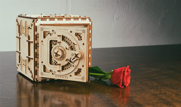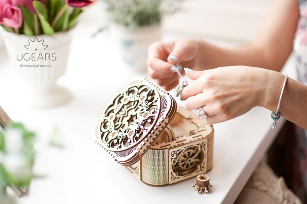 Перед вами один из стопроцентных хитов UGEARS: шкатулка с секретом, которая открывается только с помощью специального ключика. Этот ларчик готов надежно сохранить самые дорогие женскому сердцу мелочи, а благодаря нейтральной текстуре древесины и цветочному орнаменту он будет уместно смотреться на любом туалетном столике.