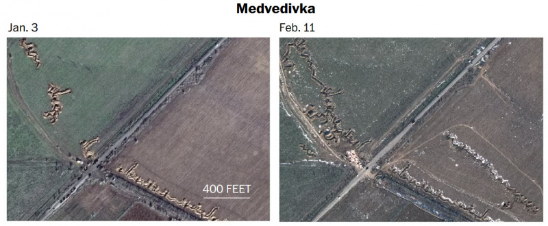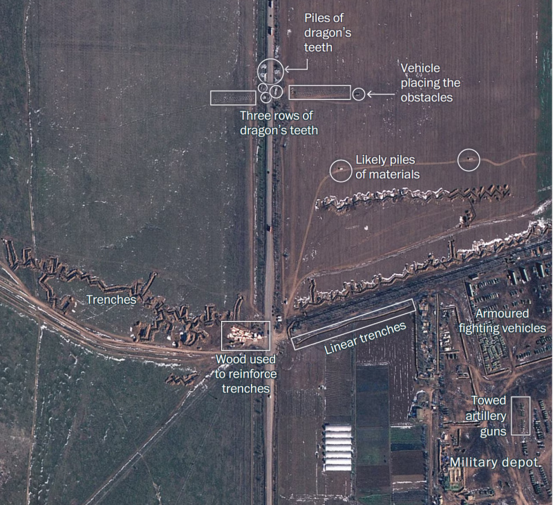 Спутниковые снимки, предоставленные The Washington Post компанией Maxar, занимающейся коммерческими космическими технологиями, показывают, что Россия построила десятки подобных оборонительных сооружений.