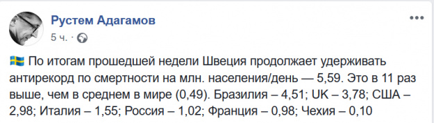Я не знаю, где он взял этот антирекорд. По данным Института Джонса Хопкинса (очень даже заслуживающего доверия источника, которым пользуются почти все), Швеция по смертности от коронавируса находится на шестом месте. И ее конкретно обгоняют страны, где вводился локдаун - Великобритания, Франция, Италия. Испания с самым жестким (и самым, замечу, идиотским) карантином в Европе от "беззаботной и преступной" Швеции отстает всего на 0,55%.