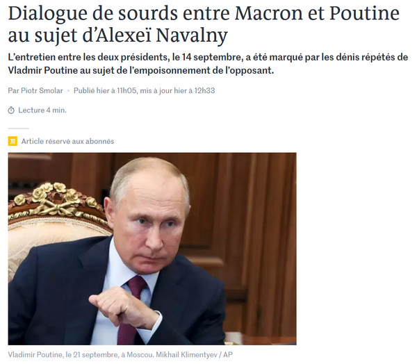Также Путин, по данным Le Monde, заявил Макрону, что Навальный использовал свой Фонд борьбы с коррупцией «в целях шантажа некоторых депутатов и чиновников» и совершал «противоправные действия». Путин допустил, что Навальный мог сам принять яд, и заявил, что нервно-паралитическое вещество «Новичок» менее сложное в изготовлении, чем принято считать. (Отсюда.)