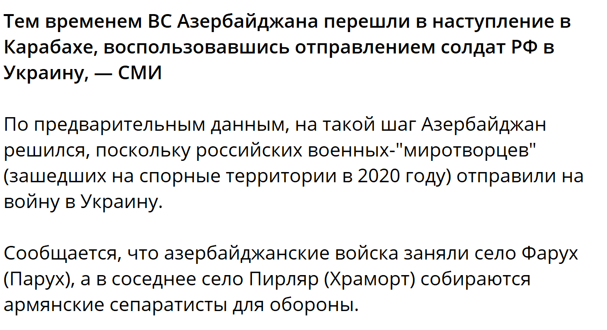В целом это было вполне ожидаемо, российских "миротворцев" вывели, а России сейчас не до Карабаха, так что Азербайджан вполне себе мог воспользоваться ситуацией.