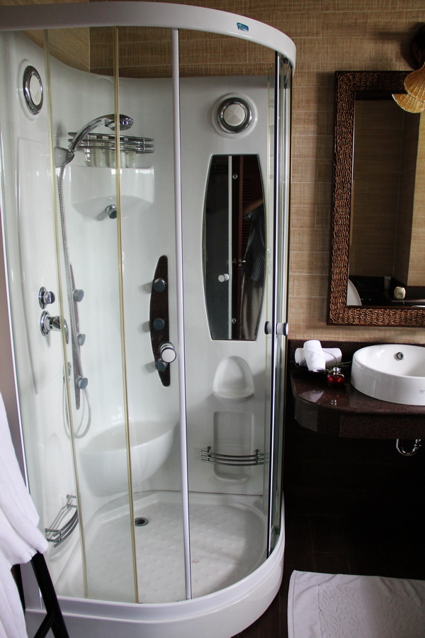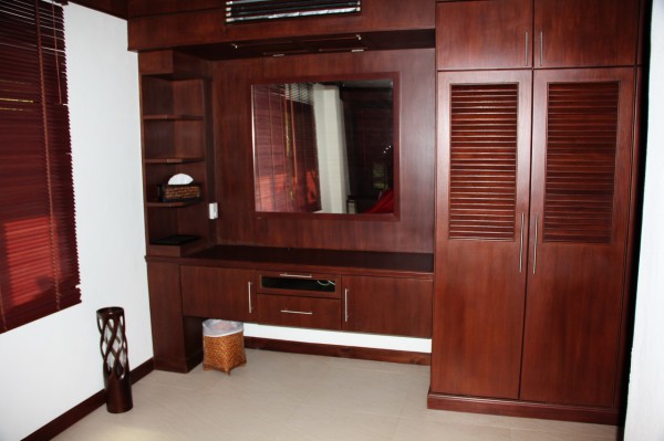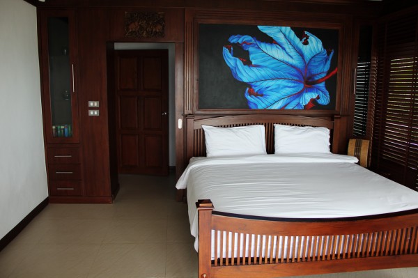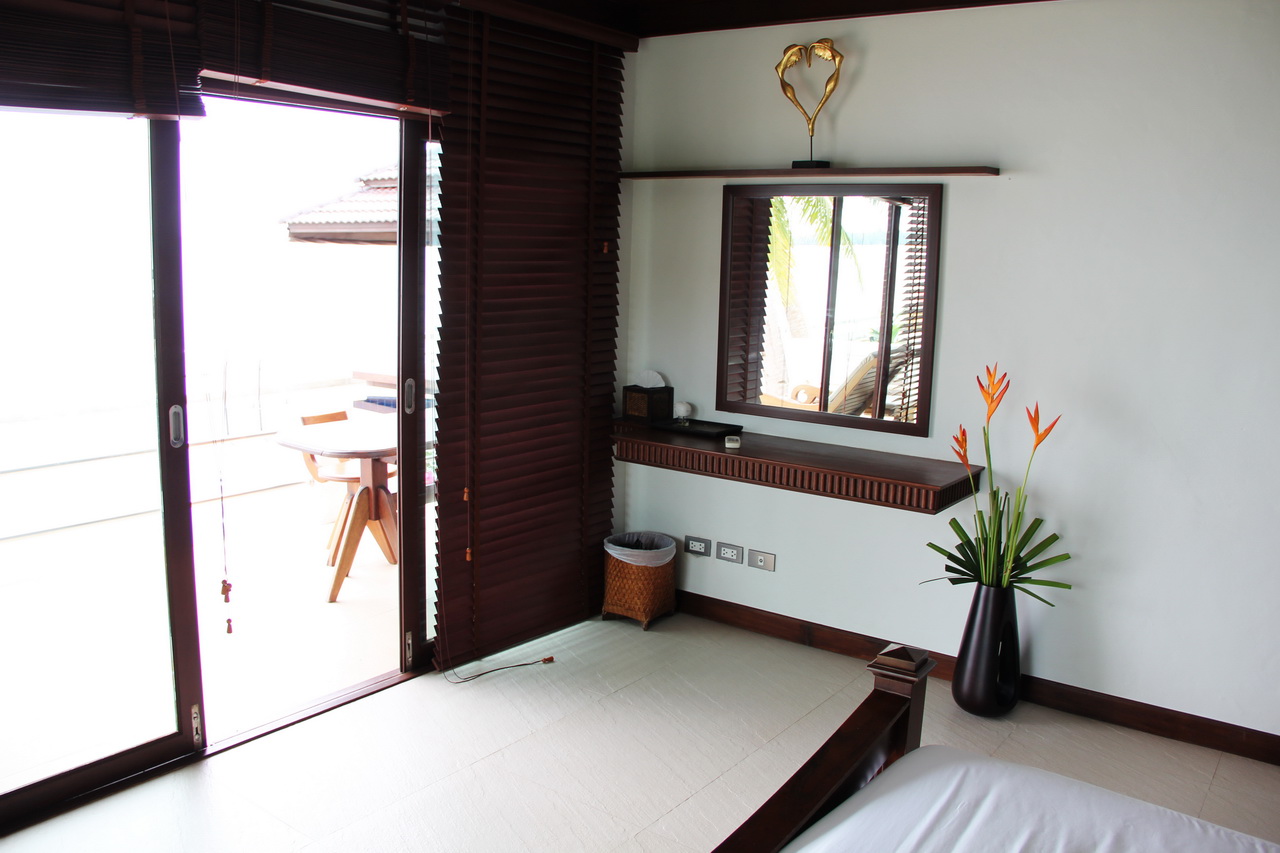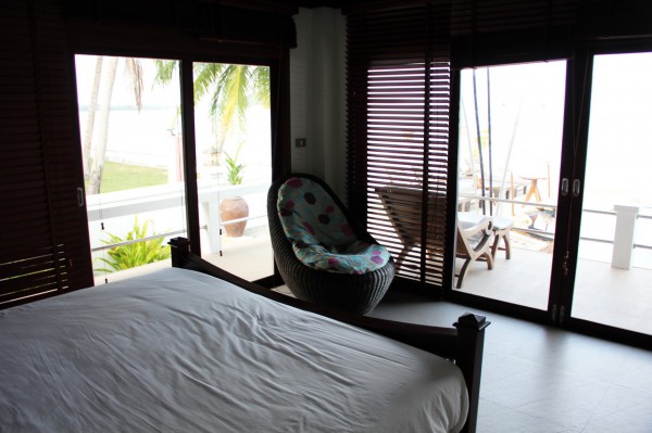 Но вернемся в дом. Две спальни, расположенные слева и справа от центральной части, смотрят прямо на залив. Они с фронтальной и боковой части снабжены отодвигающимися панелями во всю стену. Окна при необходимости закрываются специальными деревянными жалюзи. Есть встроенный в потолок кондиционер, который равномерно дует во все стороны и практически не шумит.