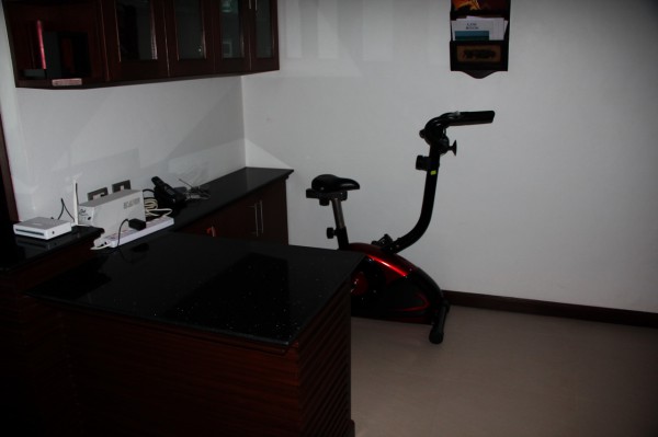 Напротив - закуток, в котором стоит роутер (Интернет приходит по ADSL, канал хороший - где-то 3 входных мегабита на выходной мегабит, Wi-Fi добивает по всей территории) и велотренажер.