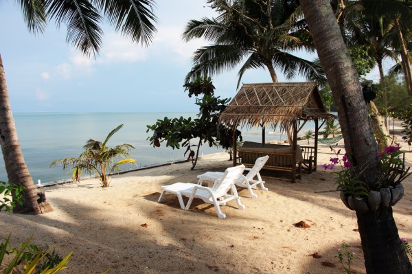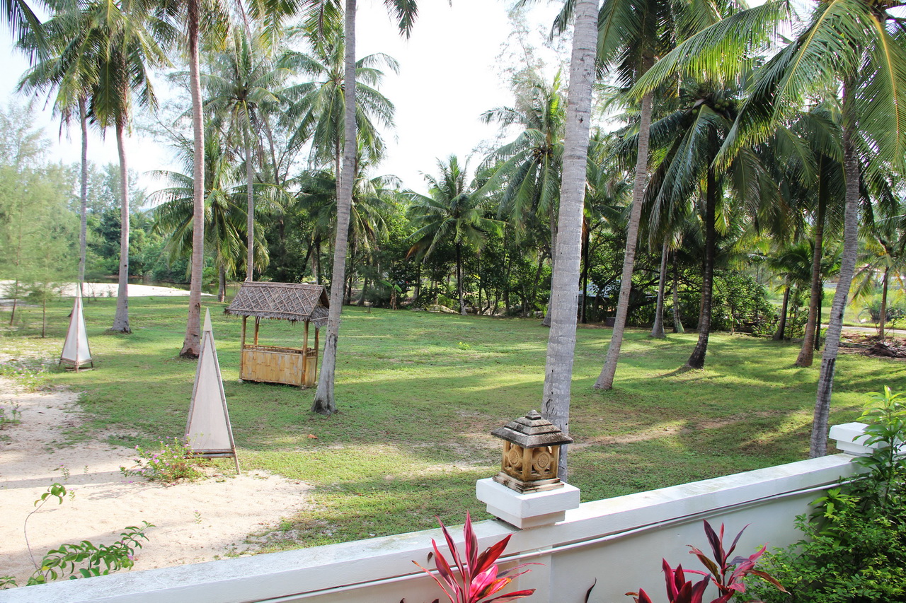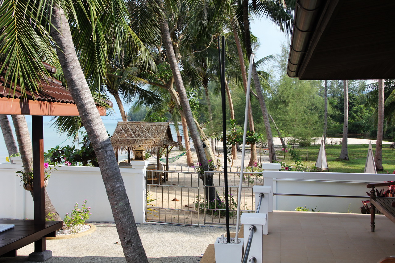 Справа - собственная территория с пальмовой рощей. Там есть шезлонги, гамак, домик с лежаками, сооружение с факелами - чтобы ночью устраивать барбекю и все такое.