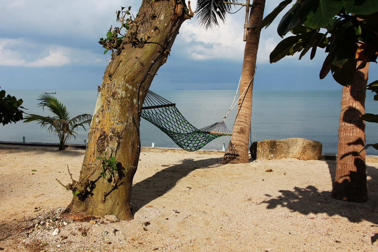 Залив - прямо под ногами, в любой момент можно спуститься и поплавать - вода в заливе очень теплая. Единственное - в момент прилива пляж почти "съедается", однако во время отлива он получается вполне приличный. Кроме того, даже в момент прилива можно балдеть в шезлонгах на песочке пальмовой рощи.