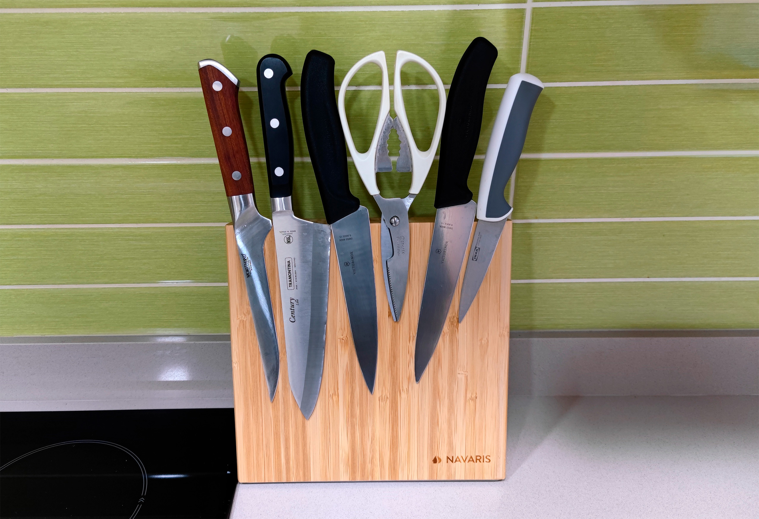 Ножницы не каждый день используются на кухне, их лучше убрать отсюда, они явно мешают брать ножи.