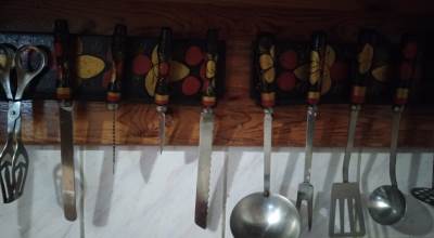 Недостаток готовых ножевых блоков, типа верхнего, в том, что они как правило сделаны под набор ножей определенного размера и разместить произвольное количество ножей разного размера бывает сложно. Я себе ножевой блок сделал сам из трех пар скрепленных брусков тропического дерева (я брал дуглазию, но можно любое), образующих две длинные щели, куда и подвешиваются ножи вдоль, в произвольном порядке. Да, несколько массивно - но удобно.