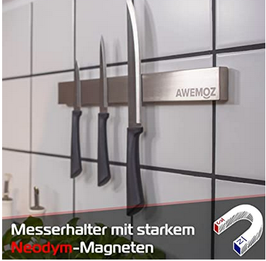 Не прошло и пяти лет, как я понял, что она достаточно неудобная, и что намного удобнее - иметь магнитную подставку-держалку (увидел у кого-то). Можно, конечно, на стену прикрепить магнитную полосу, как это многие делают, но это затрудняет мытье плитки, да и сверлить стенку не хотелось, поэтому нашел именно магнитную подставку - вот такую, немецкую. И так намного, намного удобнее пользоваться. Только керамический мусат пришлось убрать в ящик с приборами, но это вполне переживаемо.