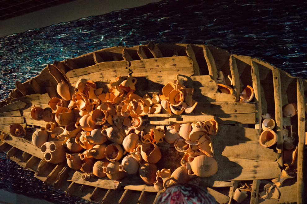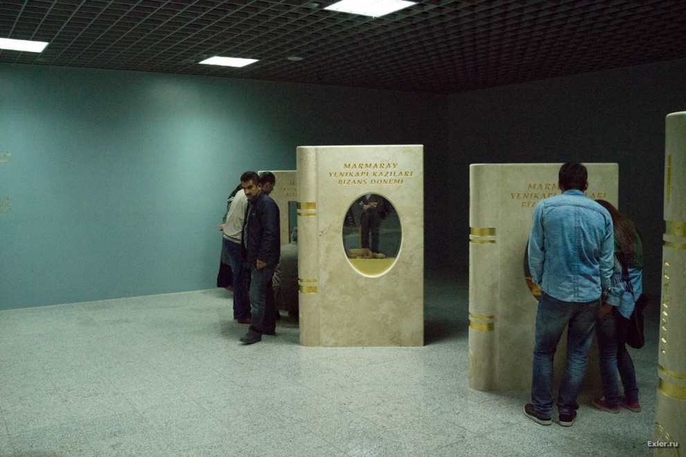 А здесь, на станции, выставлены археологические находки, которые были обнаружены при строительстве туннеля. Из-за этого, кстати, строительство затянулось на лишних четыре года: строителям приходилось буквально просеивать каждый кубометр вытащенной породы.