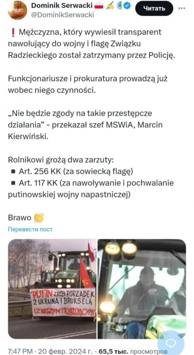 По поводу плаката. Пишут, что польская полиция уже задержала фермера, вывесившего на своём тракторе советский флаг и этот плакат. Ему уже вменяют две статьи: пропаганду тоталитарной идеологии (за флаг, до 3 лет) и призывы к захватнической войне (за плакат, от 3 месяцев до 5 лет). Так что большой любитель Путина имеет все шансы на некоторое время присесть.
