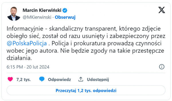 Министр внутренних дел Марчин Кервинский в своем твиттере написал: "Для информации - скандальный баннер, фото которого распространилось в Интернете, был немедленно удален и зафиксирован полицией. Полиция и прокуратура принимают меры против ее автора. Терпеть такую ​​преступную деятельность мы не будем".