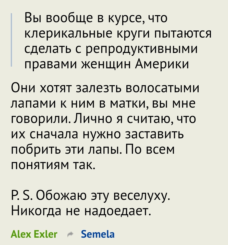 Вообще жду какую-нибудь мощную статью, в которой объяснят, что запрет на аборты (если быть точным, то весьма серьезные ужесточения ограничений) в Польше, Луизиане, Алабаме, Миссисипи, Джорджии, Миссури - происки леваков )
