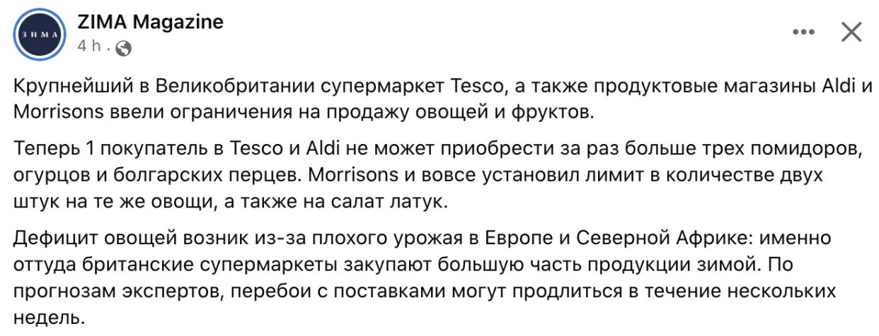 Как житель ЕС - полностью подтверждаю. Вот прям вчера Санчес выступал по телевизору и прямо сказал: "Испанцы! Помидоров не будет! Салата не будет! Репы тоже не будет - репа вся в России! Питаться будем одним хамоном, каперсами и спаржей. Мужайтесь. Отечество ОПАСНОСТЕ!"