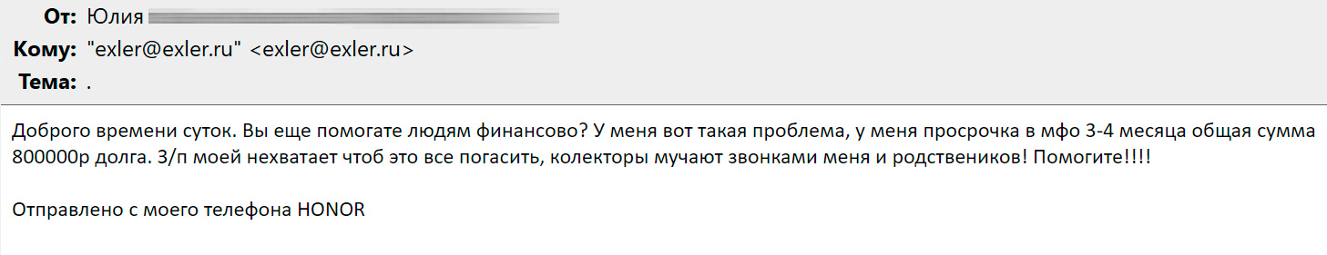 Слушайте, вот буквально только вчера опубликовал в газете "Известия" объявление "Помогаю людям финансово, заинтересованным обращаться по адресу exler@exler.ru", как уже сегодня неравнодушные люди откликнулись. Вот теперь мне есть кому помогать людям финансово, а то проклятая неопределенность мучила меня.