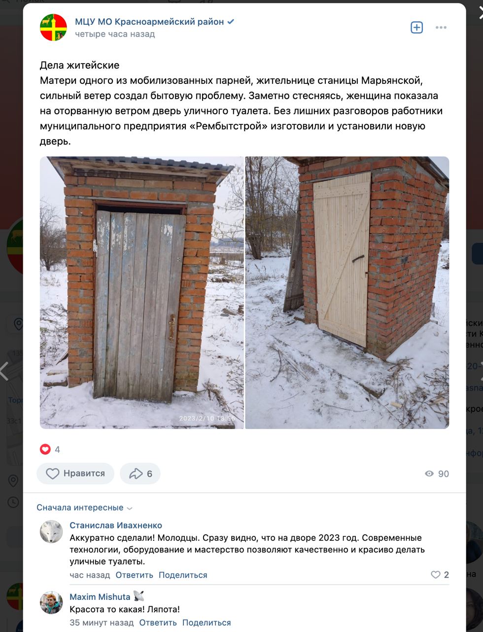 Муниципальные власти Красноармейского района Краснодарского края отчитались о том, как они починили уличный туалет матери местного мобилизованного. В комментариях отмечают, что при проведении работ использовались современные технологии, позволяющие не только быстро и качественно заменить дверь, но и соорудить на ней знак поддержки Специальной Гуманитарной Операции по Деэлектрификации Украины.