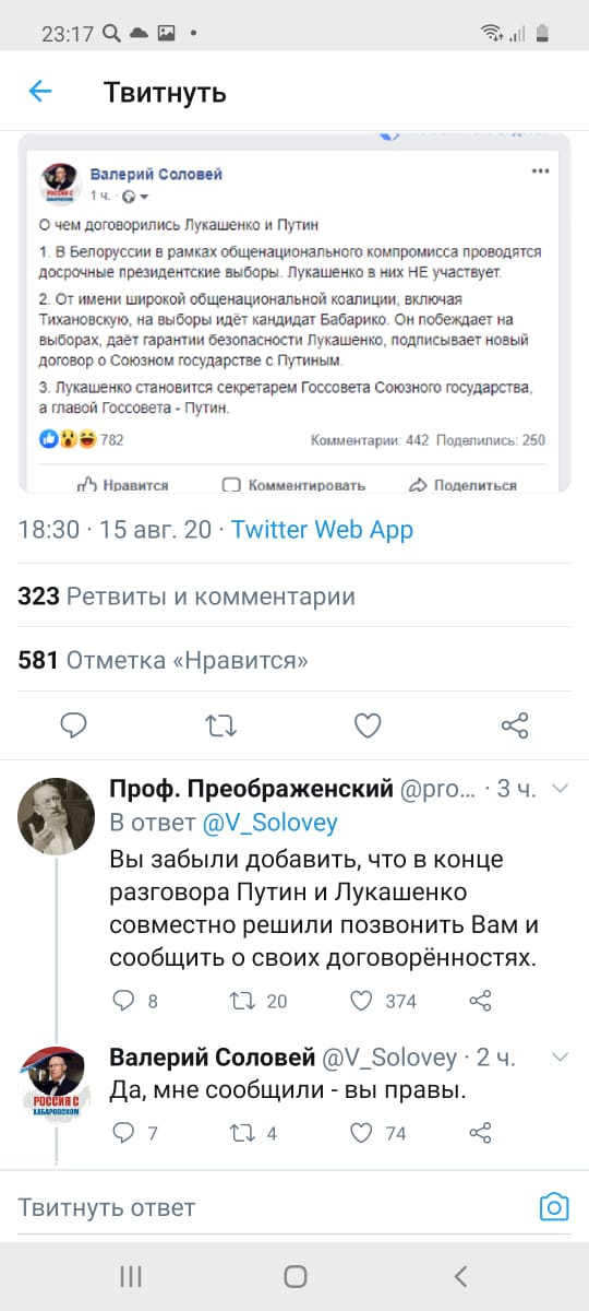 Вот прямо сейчас Соловьев переобувается в прямом эфире. Весь эфир - жестко антилукашенковский.