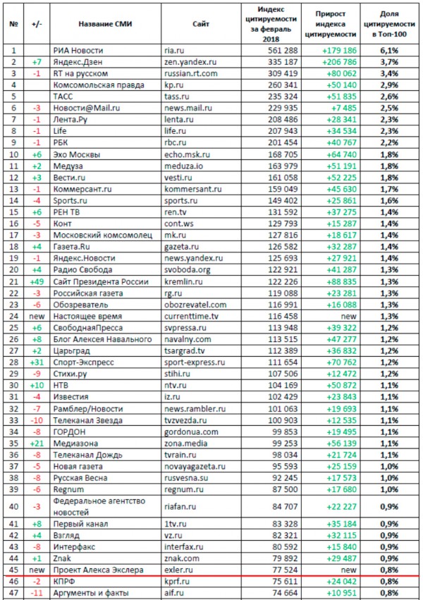 Любопытно. Сайт Exler.ru каким-то образом попал в Top100 самых цитируемых в соцмедиа медуаресурсов за февраль 2018 от BrandAnalytics. На 45 место попал. "Интерфакс"- на 43 месте, "Аргументы и факты" - на 47-м. Блог Варламова тоже туда попал первый раз - 85-е место.