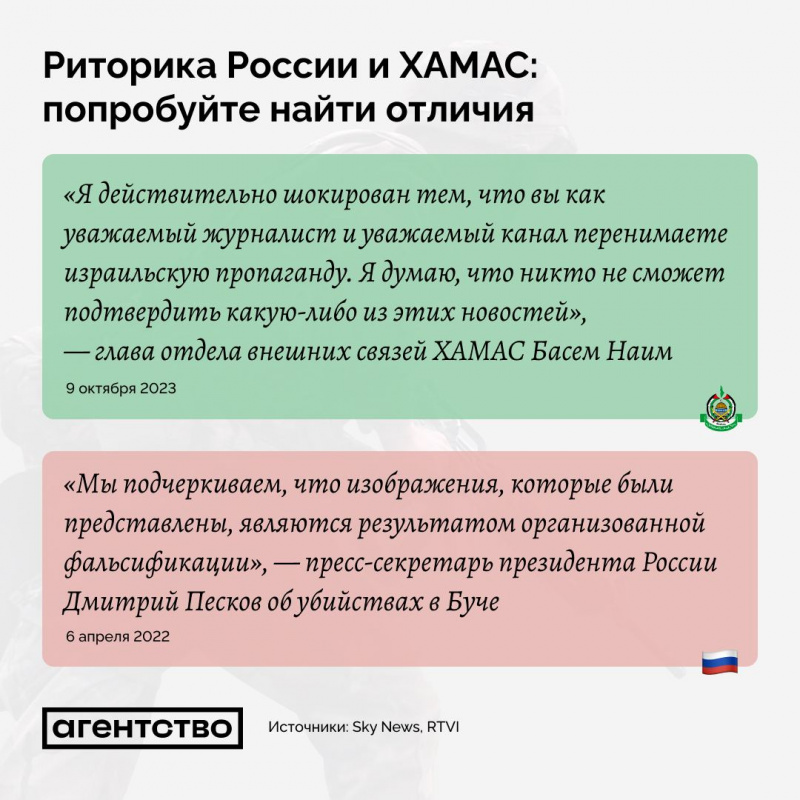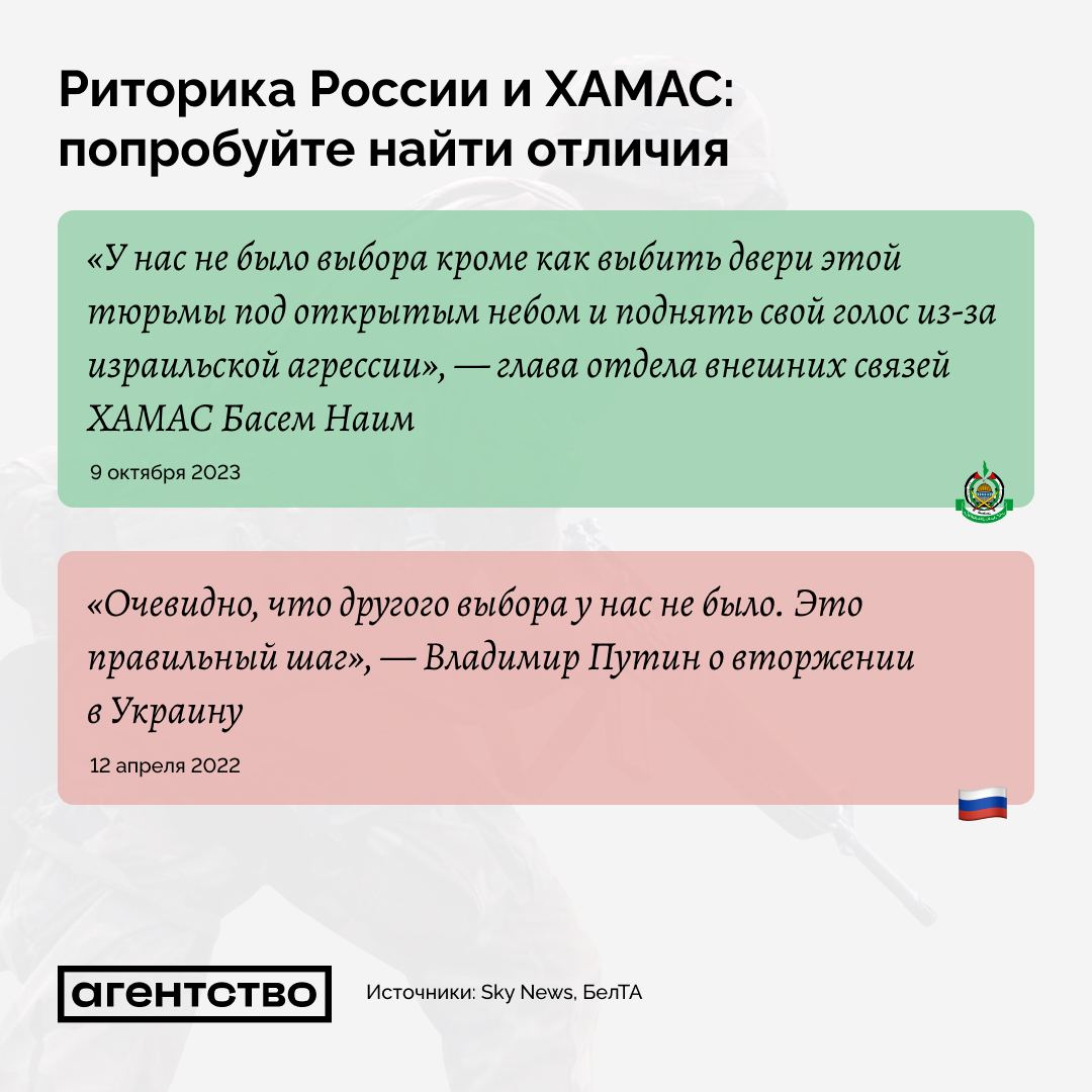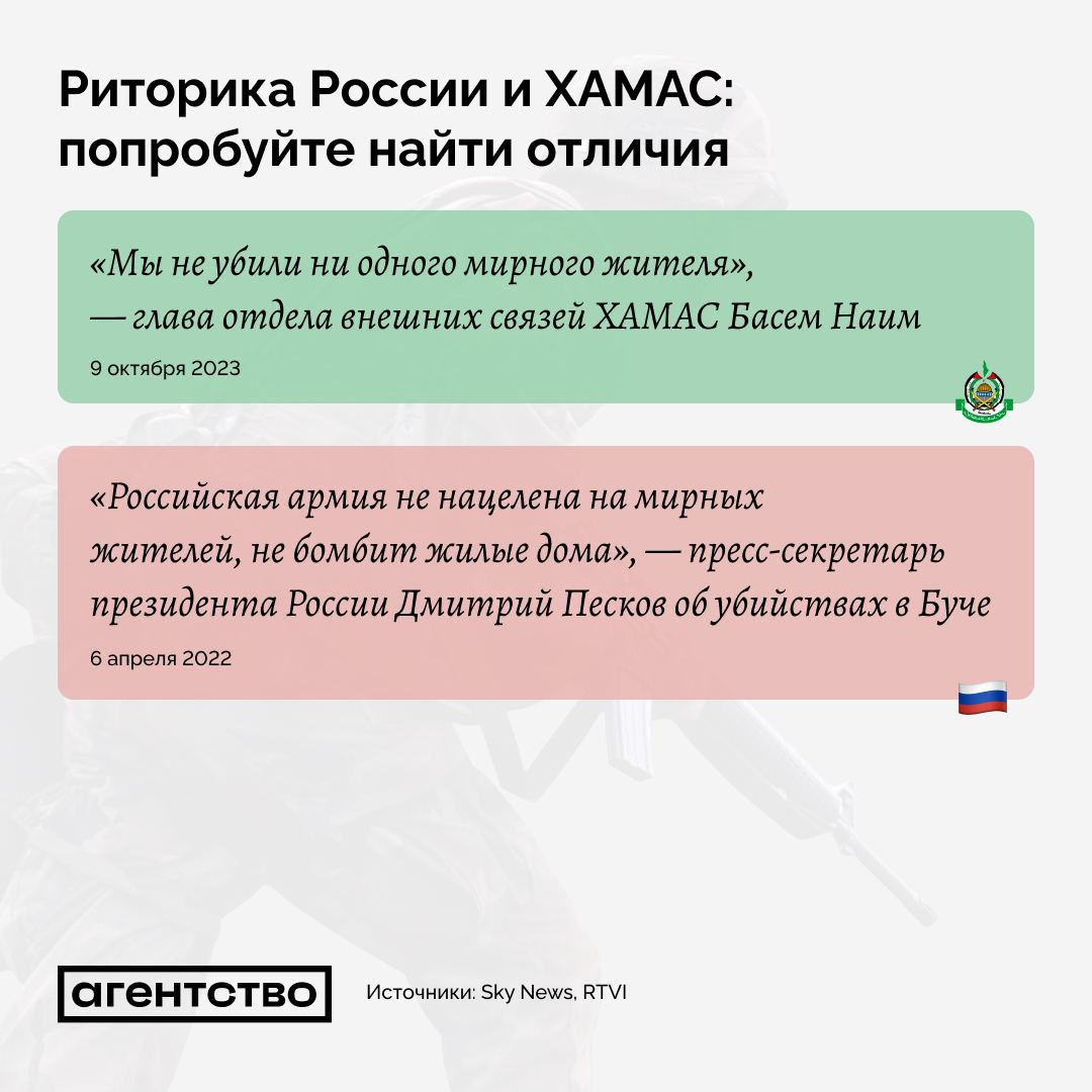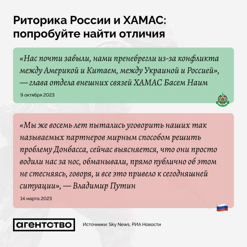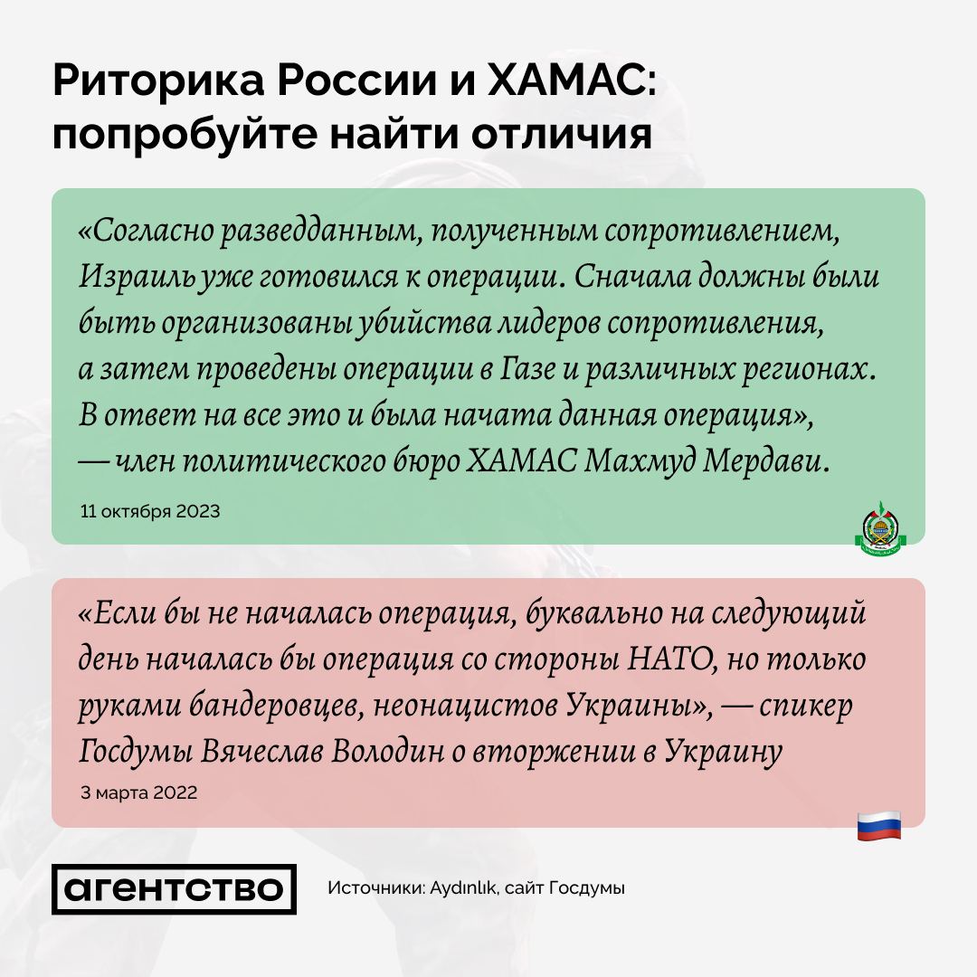 То, что нынешние заявления ХАМАС почти один в один слизаны с бесконечного вранья Путина и его шайки-лейки - отметили многие. Впрочем, кто там у кого учился - еще вопрос: Латынина, например, считает, что хамасовцы всегда себя так вели, и что это Путин учился у ХАМАС, а не наоборот. Но все просто один в один - в ТГ "Агентство Новости" сделали классную подборку.