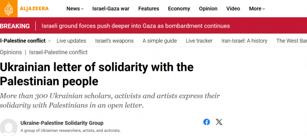 Издание Aljazeera от имени какой-то мутнейшей Ukraine-Palestine Solidarity Group опубликовало "Украинское письмо солидарности с палестинцами". Письмо подписало "более трехсот украинцев", как со вчера разгоняют в российских пропагандонных СМИ (у меня один выдающийся феномен пришел этим списком в комментах на сайте трясти). Смотрите, смотрите, сами украинцы против Израиля и за Палестину, вопят они, это все известные люди, творческие личности!