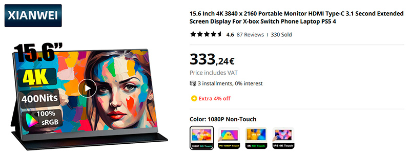 покупать такой портативный монитор с разрешением 4К для использования в качестве основного монитора с ноутбуком - оно как-то кучеряво получается, потому что такой монитор с дисплеем 15,6" и с разрешением 4К стоит уже €512