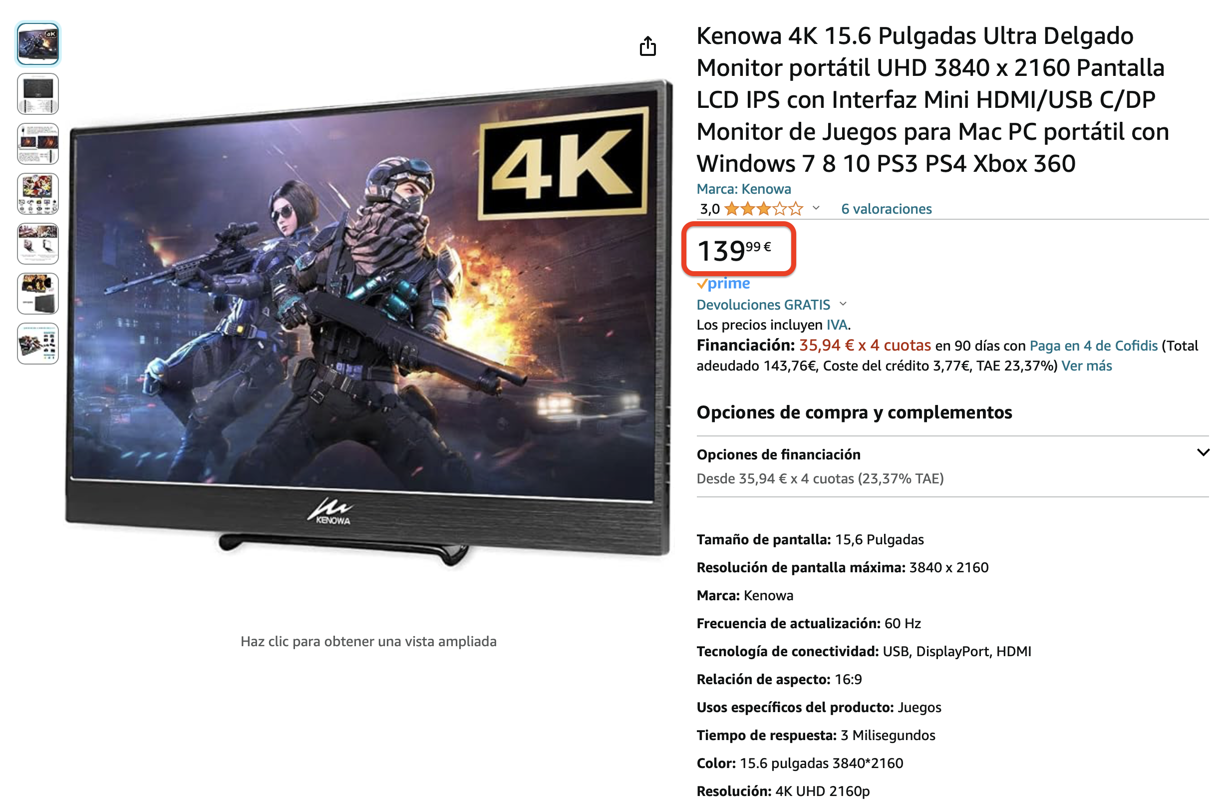 А вот покупать такой портативный монитор с разрешением 4К для использования в качестве основного монитора с ноутбуком - оно как-то кучеряво получается, потому что такой монитор с дисплеем 15,6" и с разрешением 4К стоит уже €512, а мне мой 28-дюймовый обычный монитор обошелся менее €200.