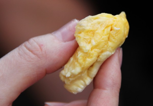 У дуриана очень своеобразная структура. Внутри белая мякоть, в которой встречаются очень неравномерные вкрапления желтой мякоти, в которых, в свою очередь, содержатся коричневые орехи.