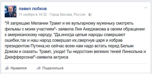 И мне это перепостили. Я, правда, не такой доверчивый, как те 500 человек, который лайкнули эту запись, поэтому полез искать, где же она такое сказала. (Излишне говорить, что я не поверил в то, что Ахеджакова могла заявить что-то подобное.)