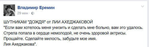 Разумеется, мутные волны от этой публикации докатились и до Ахеджаковой, которая сама в Facebook не присутствует, после чего в FB Владимира Еремина появилось вот такое опровержение.