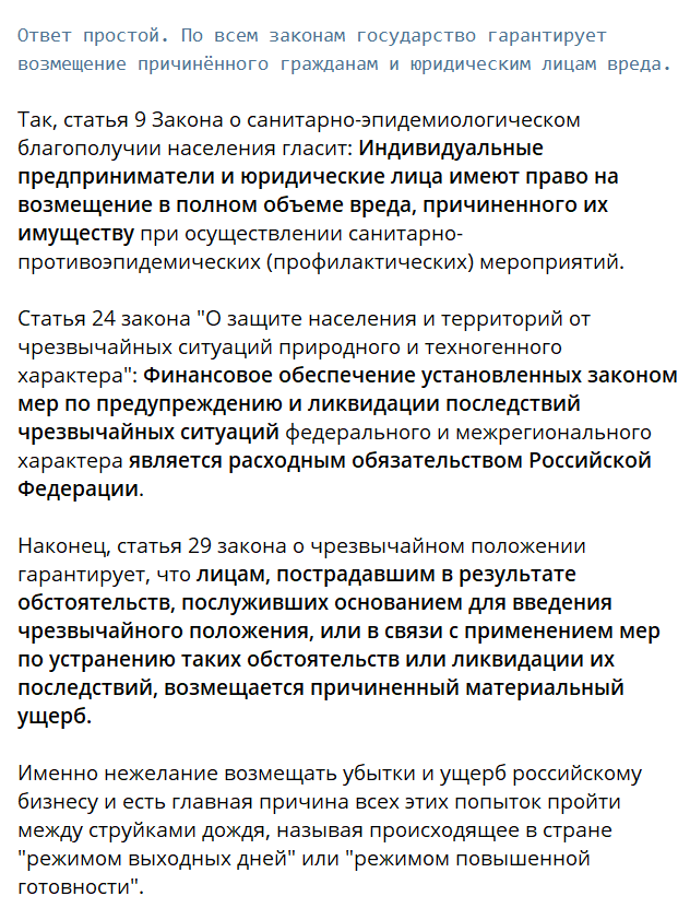 В режиме же этих вот "чрезвычайных выходных" – все проблемы по обеспечению своих сотрудников ложатся на плечи бизнеса. И тут уж либо увольнять (безработные и в перспективе крах самого бизнеса), либо чуть ли не буквально снимать с себя последние штаны (что тоже чревато крахом бизнеса и безработными, только в чуть отложенной перспективе).