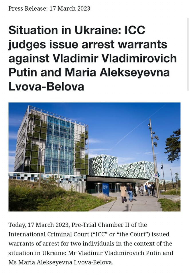 The New York Times 13 марта со ссылкой на источники писала, что в ближайшее время МУС откроет два дела против российских официальных лиц из-за предполагаемых преступлений в Украине: одно — из-за депортации украинских детей, второе- из-за намеренных ударов по гражданской инфраструктуре. В Кремле на фоне этих сообщений напомнили, что Россия не признает юрисдикцию Международного уголовного суда.