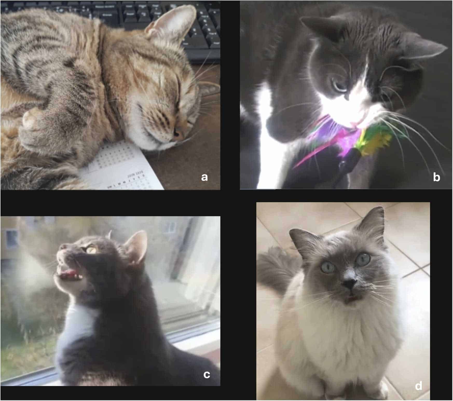 Четыре категории выражения эмоций/поведения кошек: довольство (a), недовольство (b), хищническое поведение (c) и приставание (d)