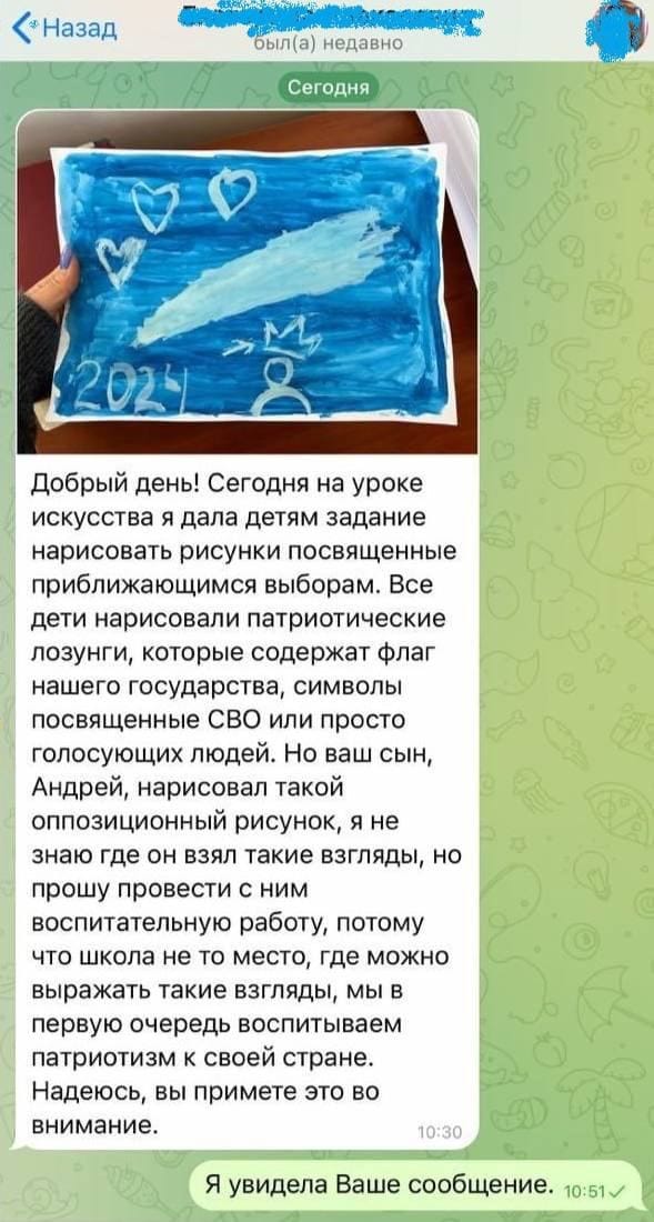 Учительница проводила урок искусства и просила нарисовать рисунки, посвященные приближающимся выборам Путина всея Руси. Ну, нынче такое в РФ искусство.