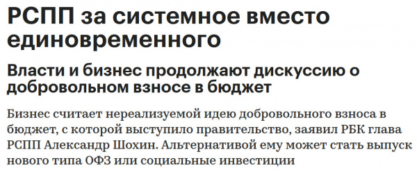 «Добровольный взнос от бизнеса, да, он обсуждается, однократный», – сообщил Белоусов. Он отметил, что финансовые результаты прошлого года «были очень хорошие» и у многих компаний, особенно в первом полугодии, за первые три квартала, результаты были «сильно в плюс». Сейчас эта тема находится в дискуссии, добавил он.