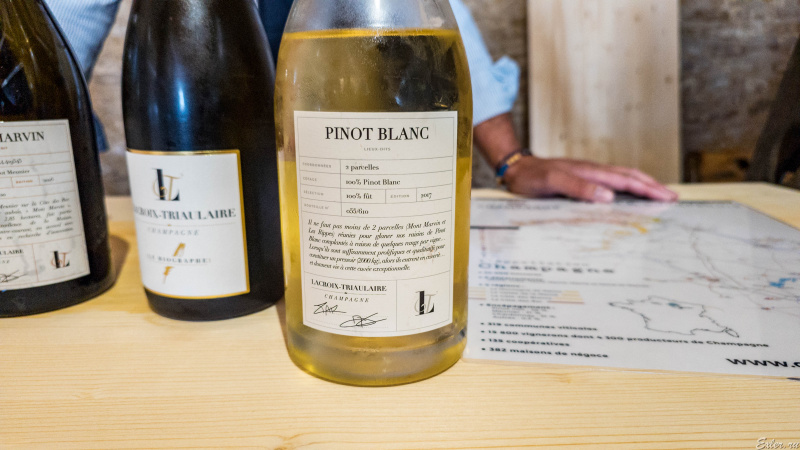 Из особенно интересного - сразу у нескольких хозяйств были представлены вина, сделанные не из традиционных сортов для шампанского - пино-нуар, шардоне, пино-менье, - а из некоторых условно "забытых" сортов, таких как пино-блан и пино-гри. Пино-бланов я попробовал три разных варианта - как-то ни один не произвел впечатление. Нет, попробовать-то интересно, но и только-то. А вот один из представленных пино-гри был прямо-таки вполне достойный покупки, тем более что и цена была более или менее разумная.