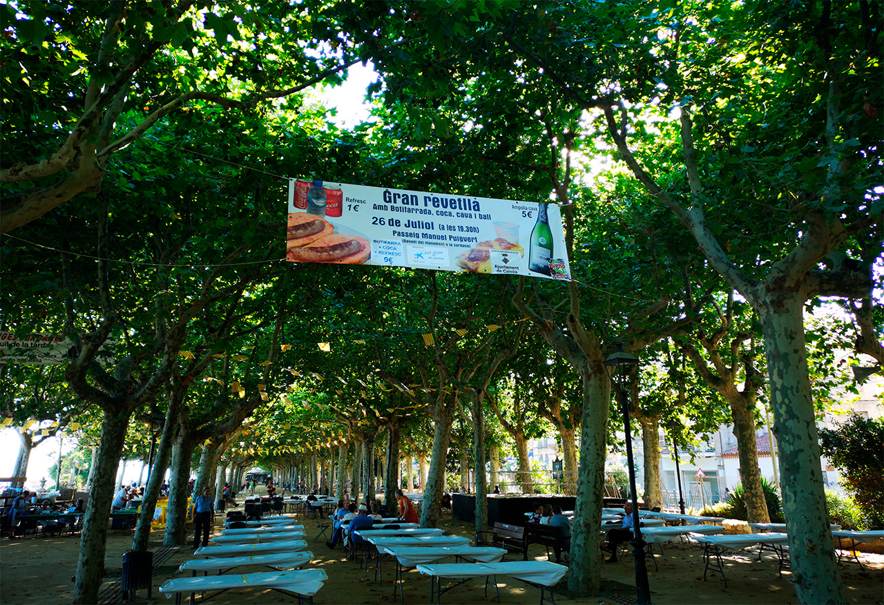 Классическое развлечение нашего городка. Муниципалитет вместе с каким-нибудь спонсором (в данном случае - отделением банка La Caixa в Calella) устраивает небольшой праздник для всех желающих. На аллее набережной расставляют столы, что-нибудь жарят-парят и угощают какими-то напитками. Это все за деньги, но небольшие. В данном случае - бутифара (крупная колбаска) на каталанском хлебе, натертом помидором, плюс баночка колы плюс бутылочка воды - €9. Кто хочет пороскошествовать - бутылка кавы (игристого) €5 (это фактически магазинная цена, в ресторане бокал кавы стоит пятерку).